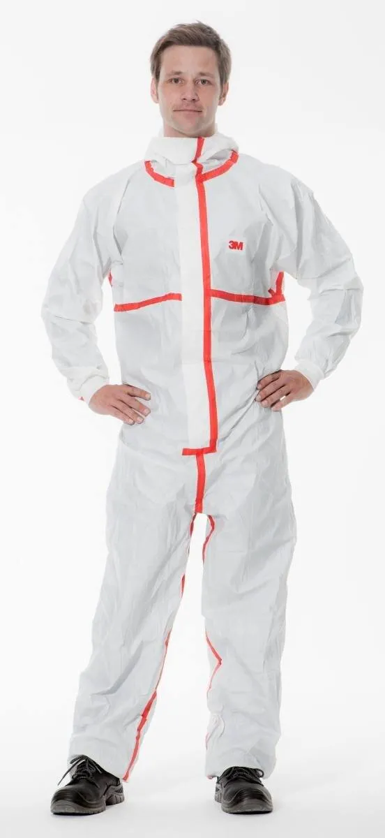 Aktion!3M 4565 Schutzanzug, weiss+rot, Typ 4/5/6, Grösse M, extrem robust, versiegelte Nähte, Material Nicht-Mikroporöses PE Laminat, besonders fusselarm, abklebbarer Reissverschluss, gestrickte Armbündchen
