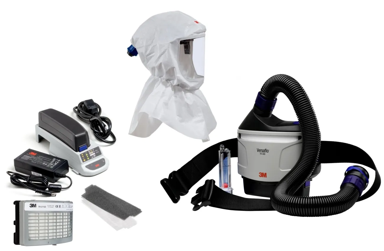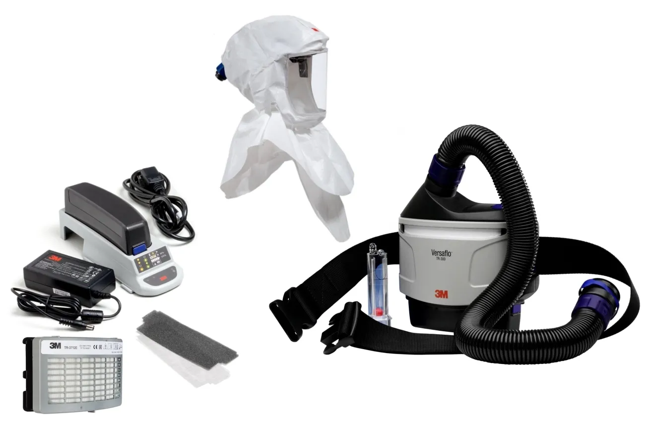 • 3M TR-315E+ Versaflo Starterpaket inkl. TR-302E, Zubehör und 3M Versaflo Premium-Leichthaube Ersatzhaube S-607 mit innenliegender Hals- und Schulterabdeckung inkl. 3M G3001 Schutzhelm, S-960 und weiteren Zubehör