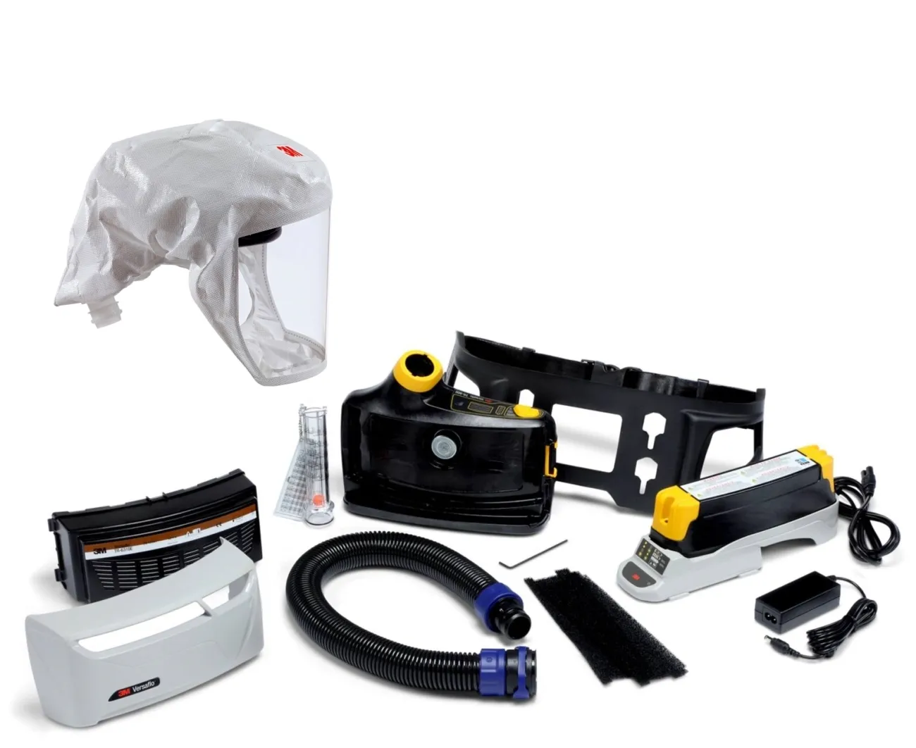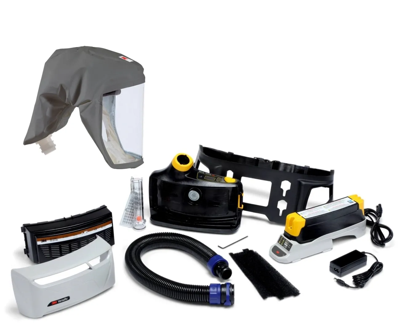• 3M TR-619E Versaflo-Starterpaket mit Gebläseeinheit TR-602E (Gebläse, Filterabdeckung), 1x A2P R SL Filter, 10x Vorfilter, Standard-Gürtel, Batterie Lithium-Ionen 8 Std., Ladegerät, BT-30 längenverstellbarer Luftschlauch, Luftstromindikator